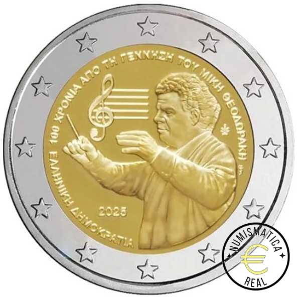 GRECIA 2025 2 EUROS CONMEMORATIVA UNC – 100 AÑOS DEL NACIMIENTO DE MIKIS THEODORAKIS – S/C.