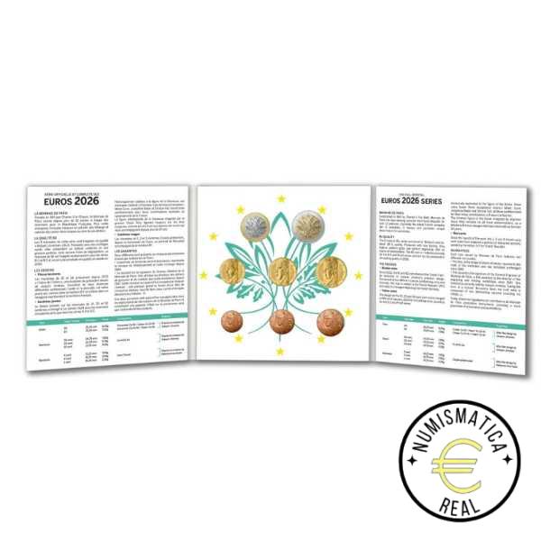Esta serie oficial contiene las ocho monedas francesas de circulación en calidad Brillante Sin Circular (BU). Celebra la figura del Genio.