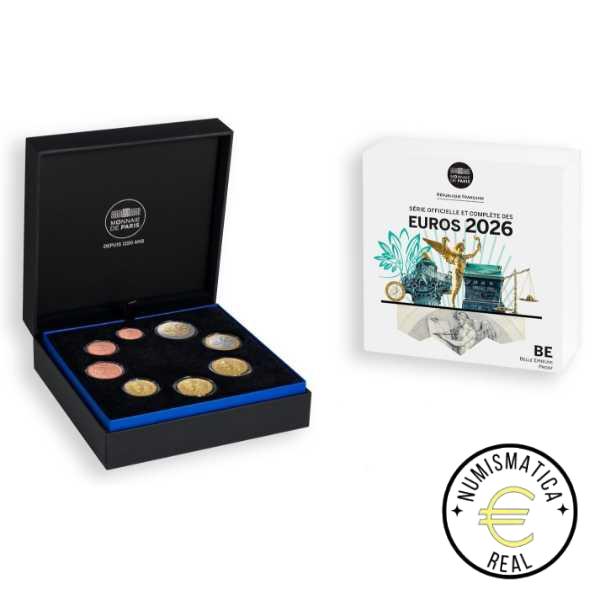 Esta serie oficial contiene las ocho monedas francesas de circulación en calidad Proof (BE). Su estuche presenta la figura del Genio.
